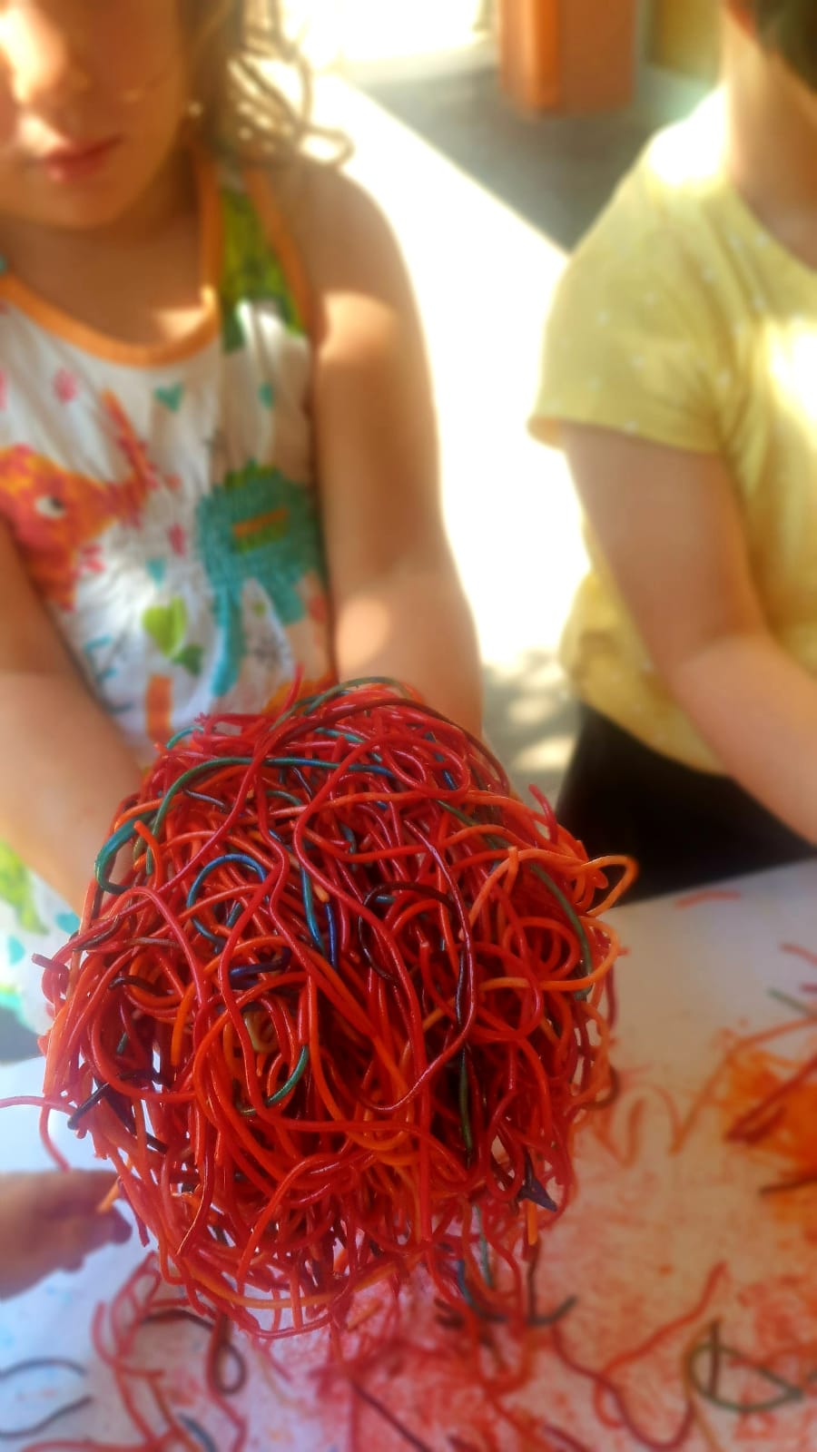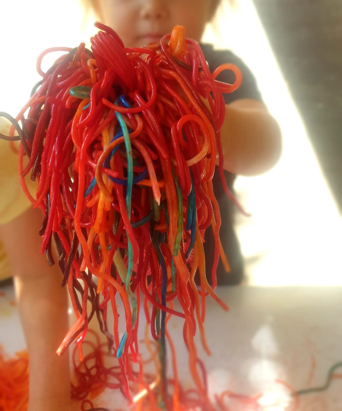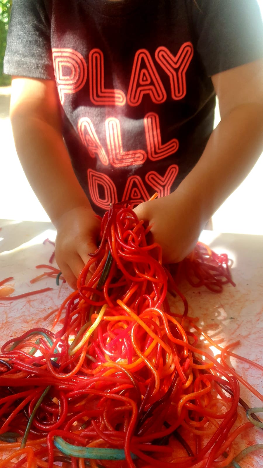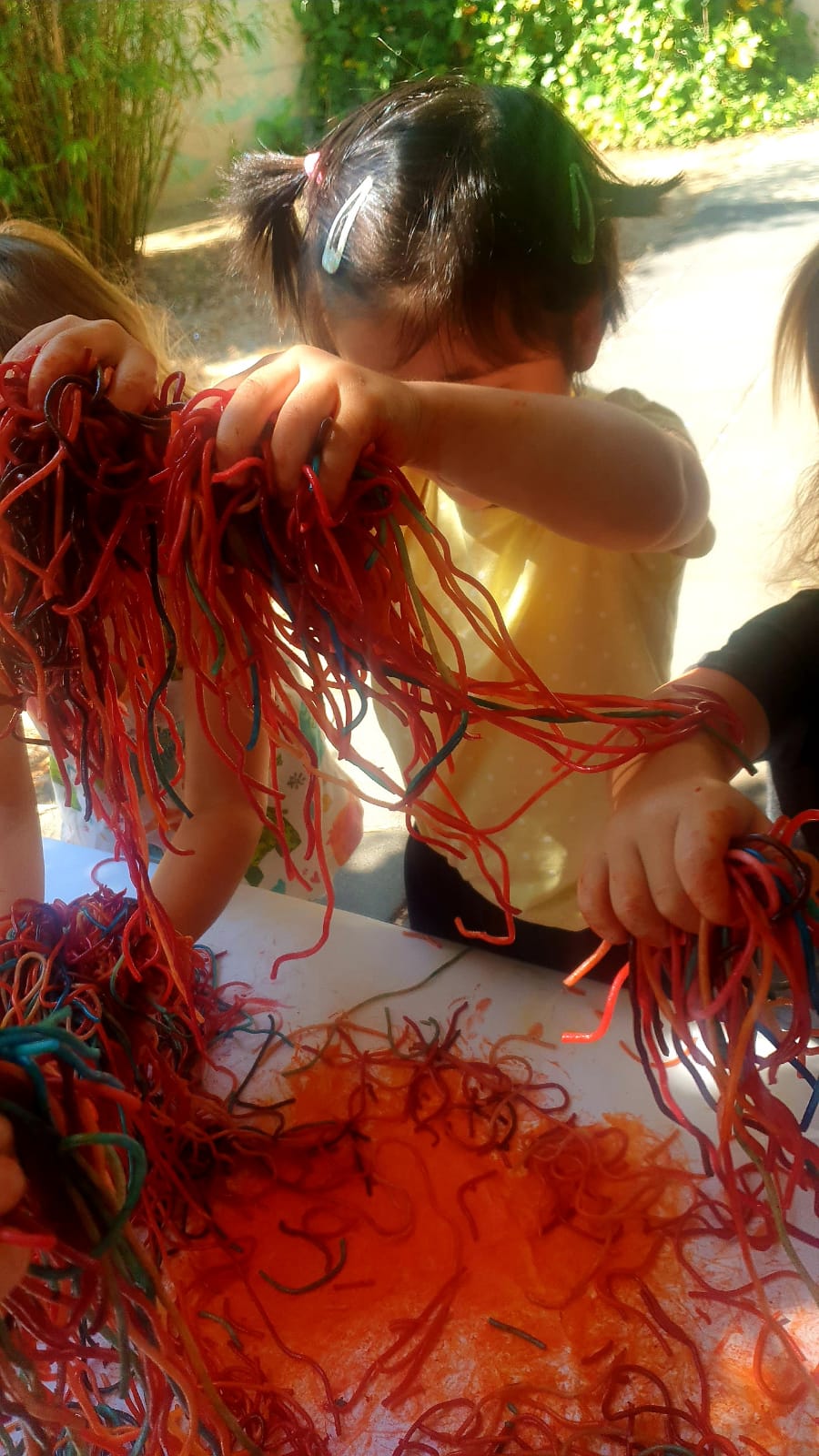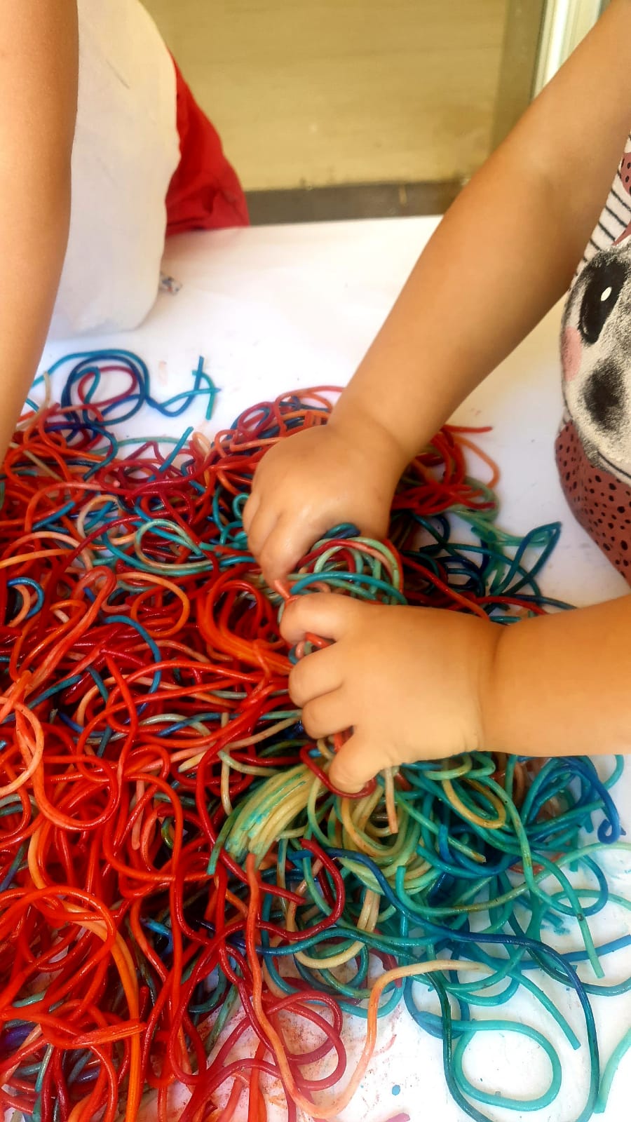 Ens divertim observant, explorant, manipulant i experimentant amb espaguetis. Tenyim espaguetis amb colorant alimentari i pintem, tastem i descobrim!!! Molt xulo!!!