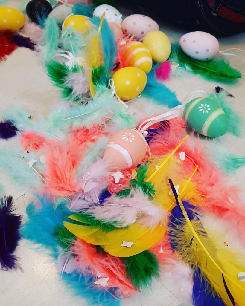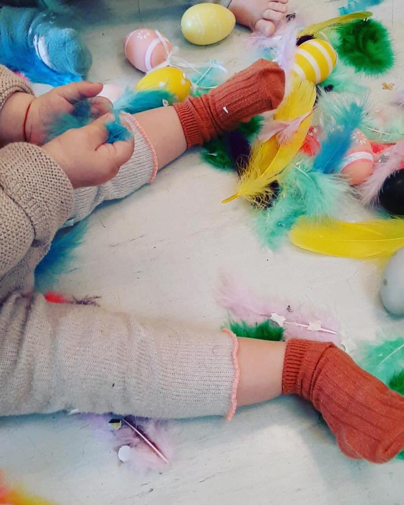 Ara que s’acosta Pasqua… els més petits manipulem, toquem i experimentem amb dos elements que no poden faltar a les mones…. les plomes i els ous… Una proposta ben relaxant…