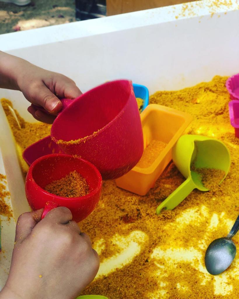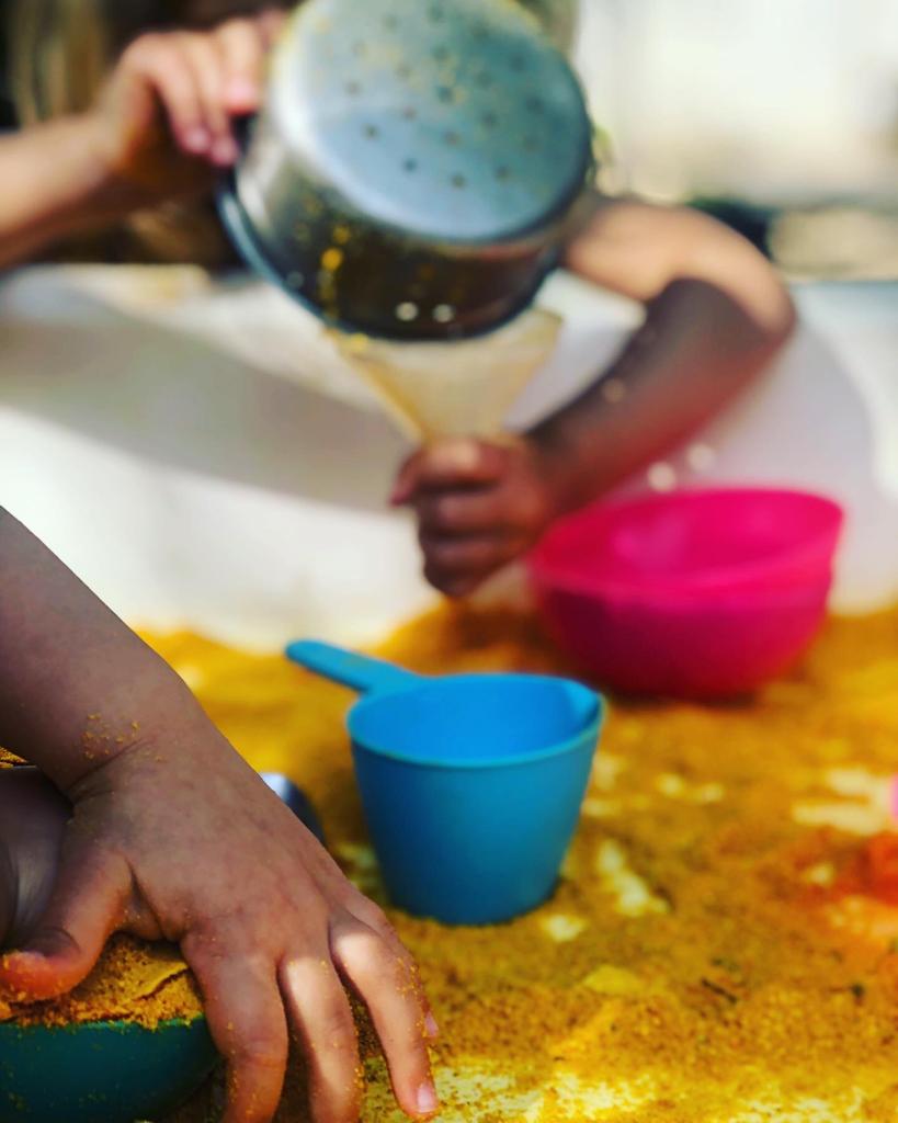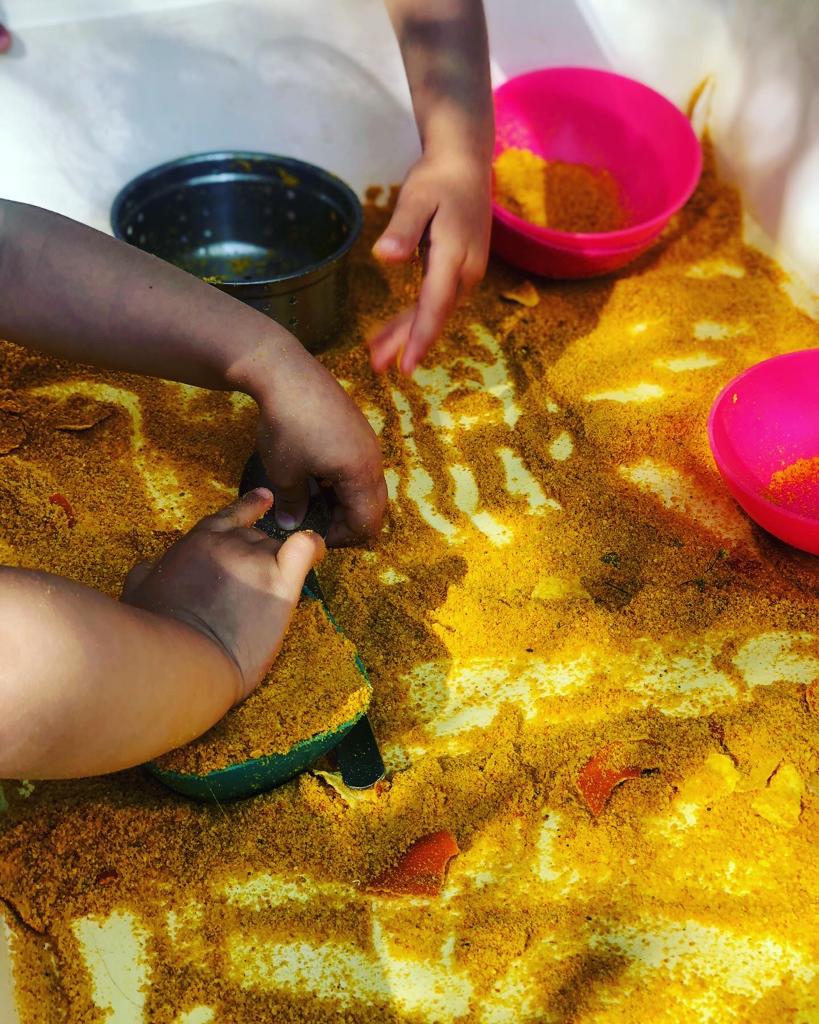 Amb el començament de la calor canviem les rutines de l’escola: Propostes de primera hora a l’exterior. Juguem i manipulem amb pols de taronja!!!