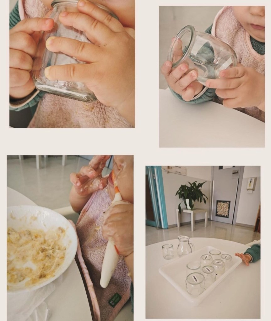 A l’escola, en els moments dels àpats, procurem afavorir l’autonomia el màxim possible. Des de I0 els infants beuen amb got de vidre, dinen a taula i tenen el seu plat per anar manipulant i provant…. la mestra acompanya aquests moments i documenta aquestes situacions d’aprenentatge significatiu.
