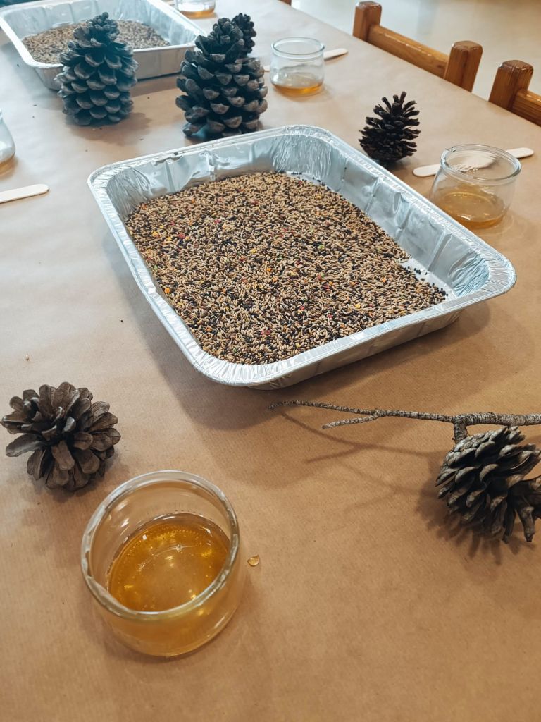 - Menjadores d’ocell amb pinyes, mel i menjar d’ocells.