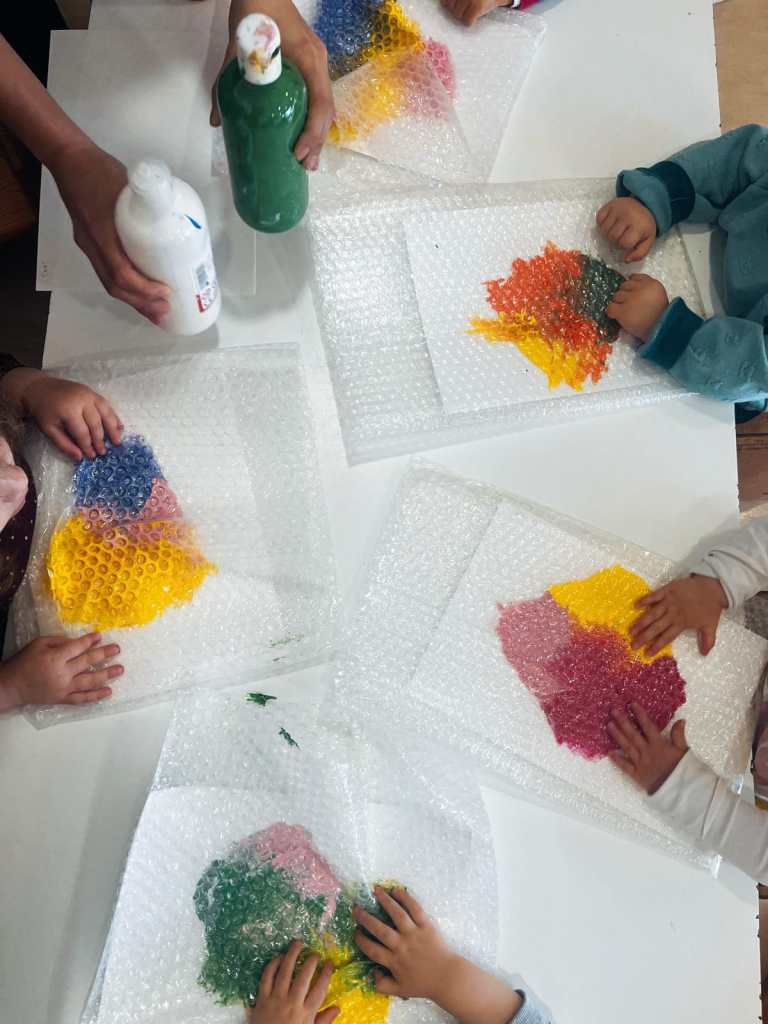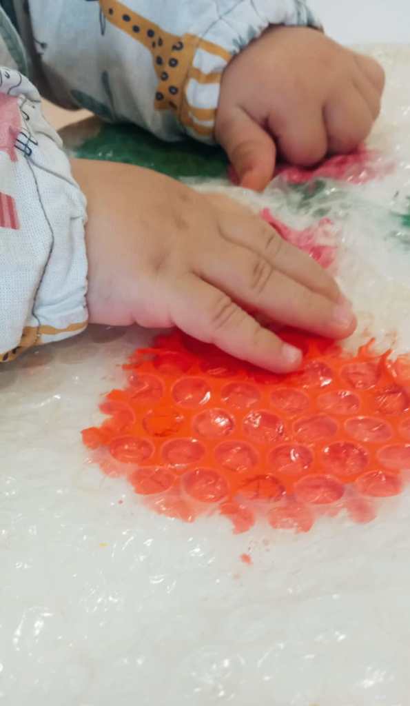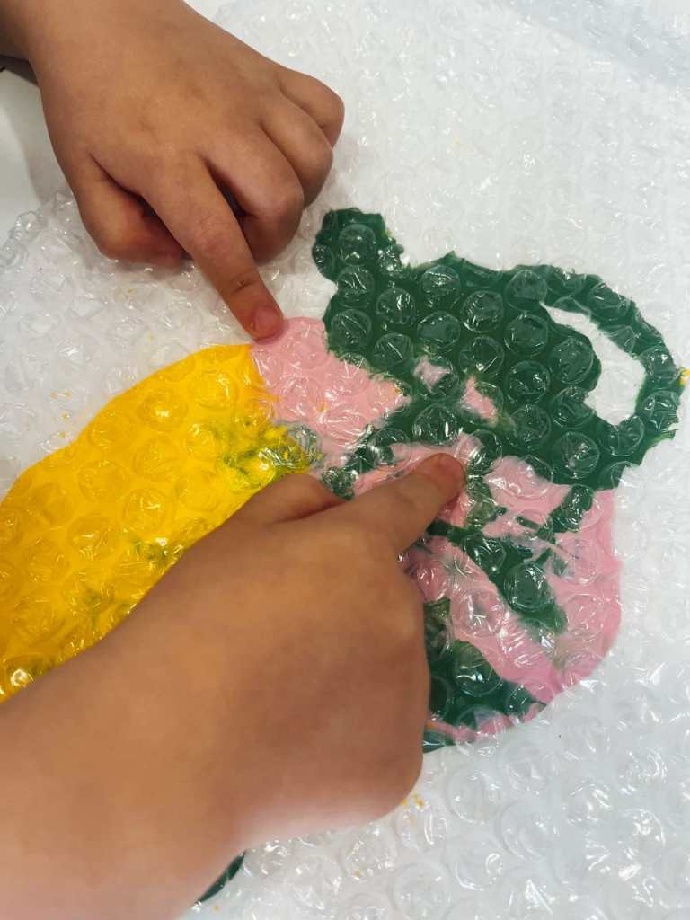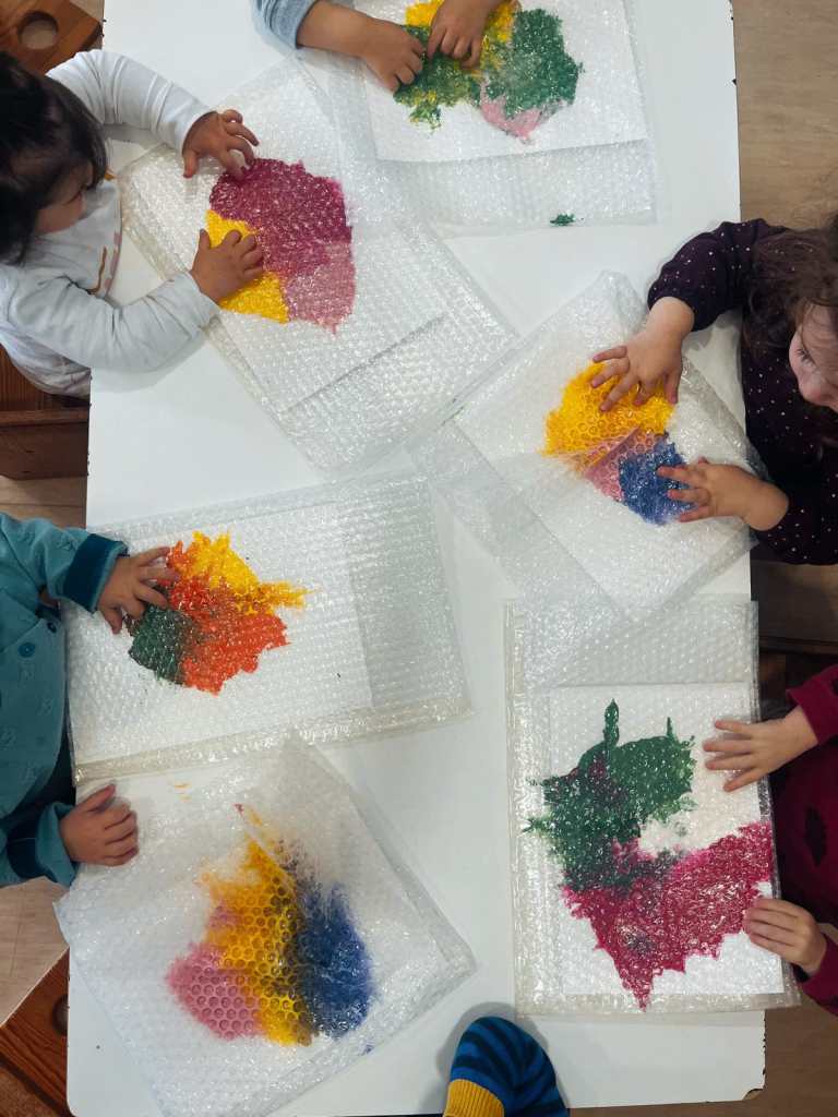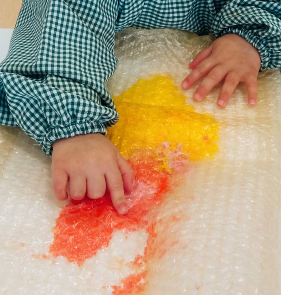L’activitat sensorial amb pintura i plàstic de bombolles estimula principalment el sentit del tacte i el de la vista. Els colors de la pintura captaran l’atenció dels infants, que en tocar-los descobriran la textura «estranya» del plàstic. Intentaran gratar les bombolles amb els dits, fent soroll i estimulant el sentit de l’oïda.