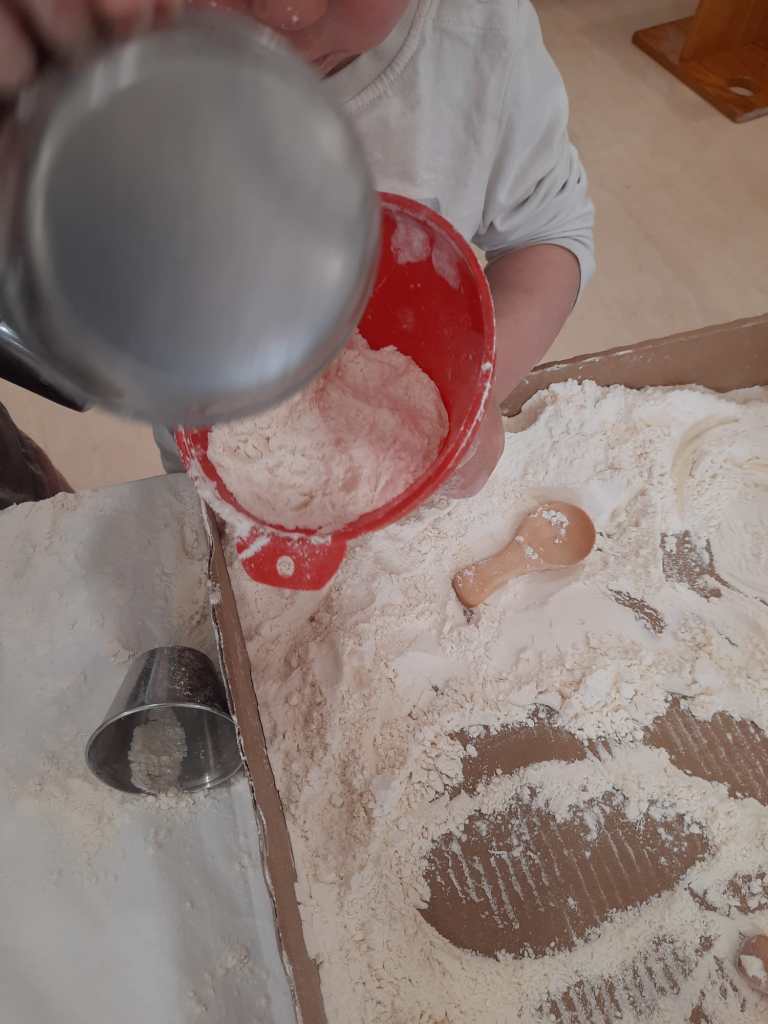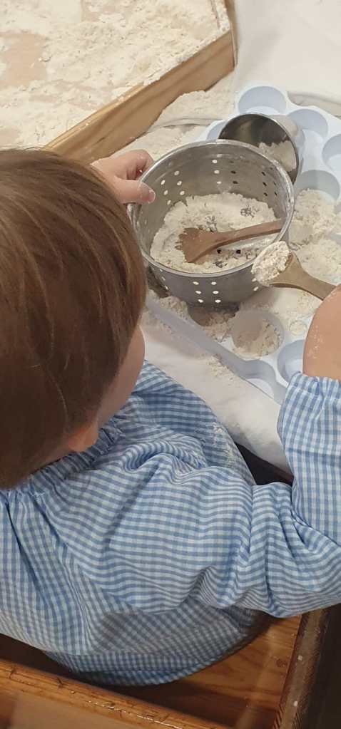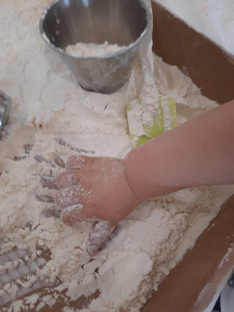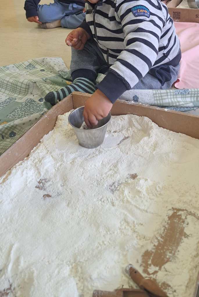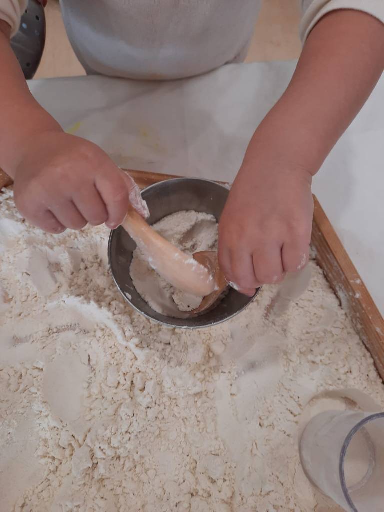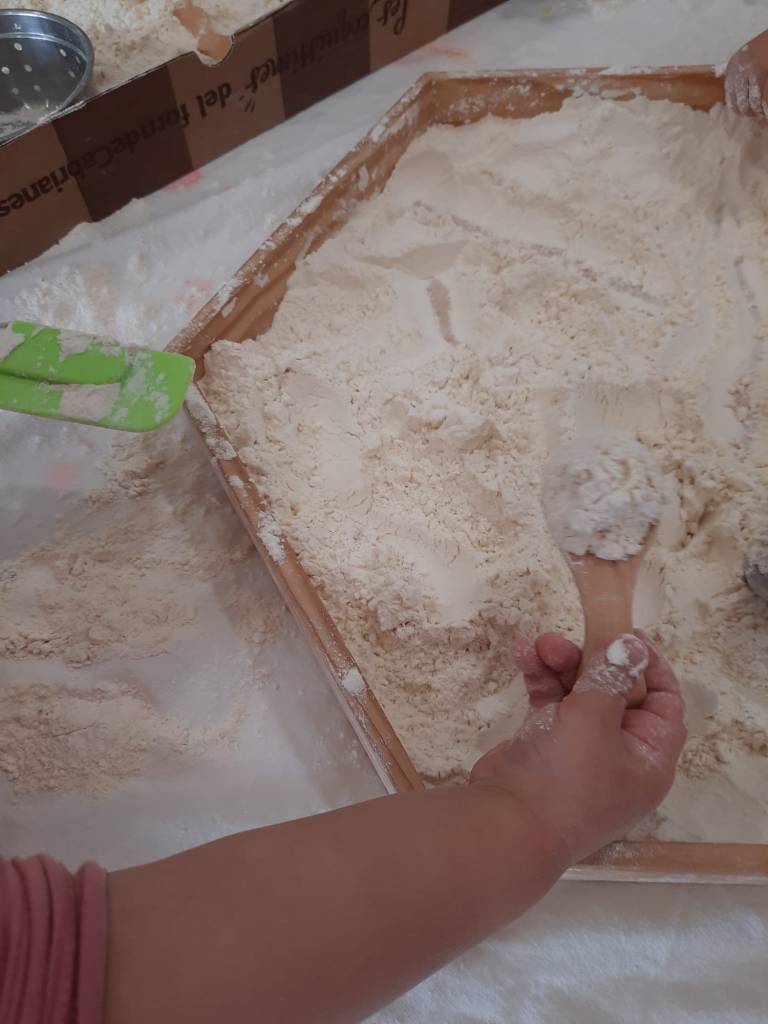 La manipulació amb farina com a proposta, és una experiència sensorial clau tant pel tacte com per a la vista. Fomenta la motricitat fina, la creativitat i la relaxació en els infants. Els permet explorar textures, pastar i traçar, millorant així la coordinació òcul-manual, la concentració i la capacitat de relaxar-se.