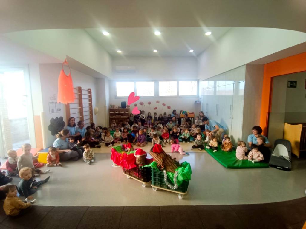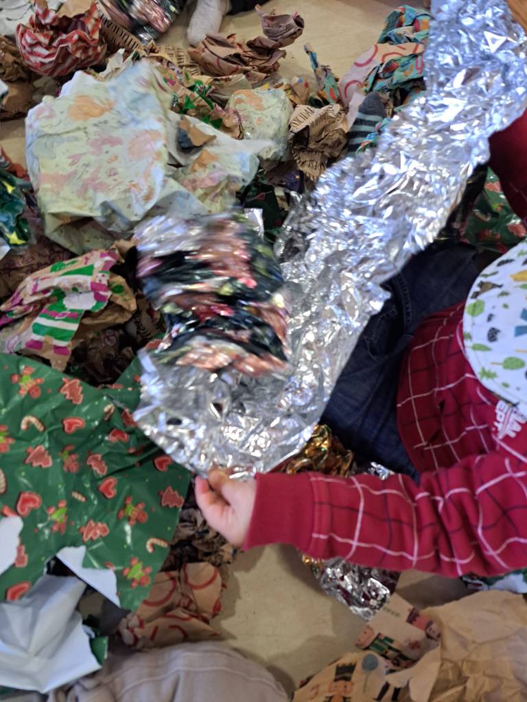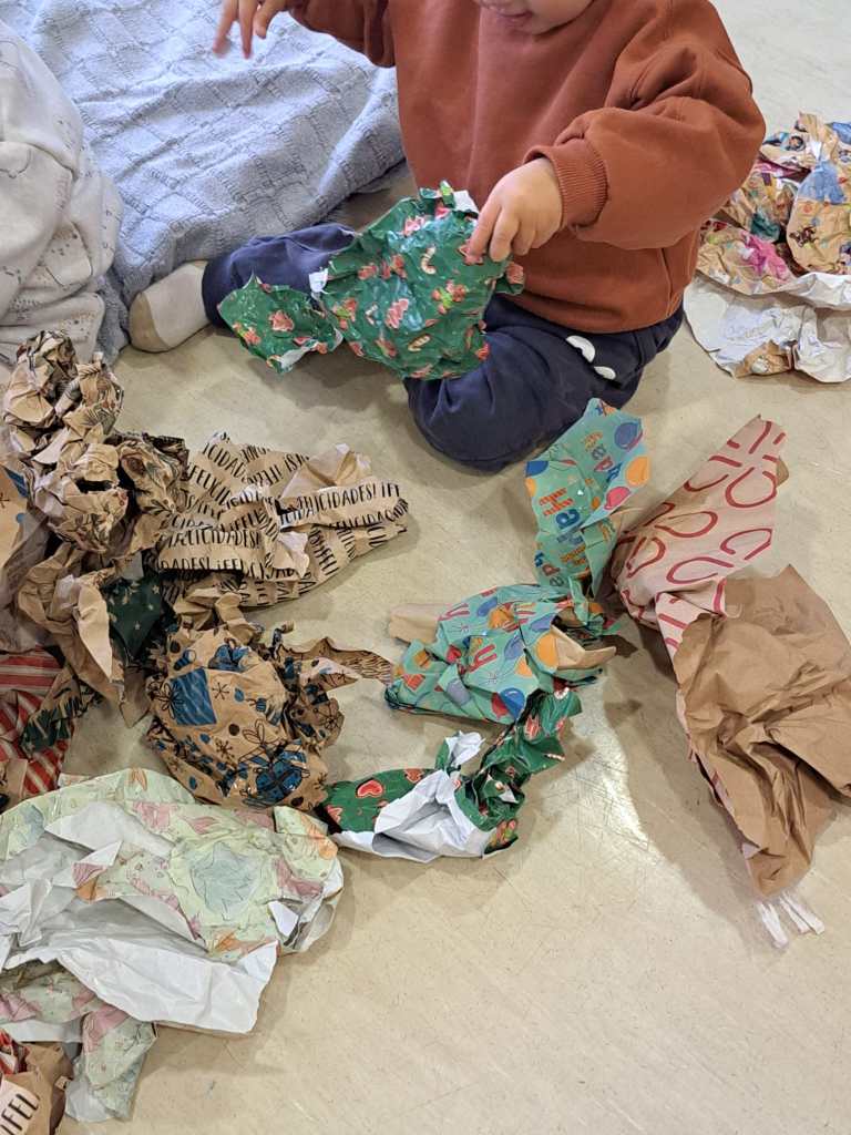 Els infants han explorat, manipulat i jugat lliurement amb el paper que havia embolicat els regals del tió de l’escola: estripar, arrugar, amagar-se, tocar textures i descobrir sons.