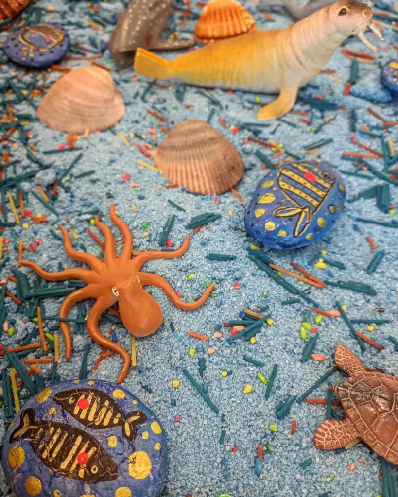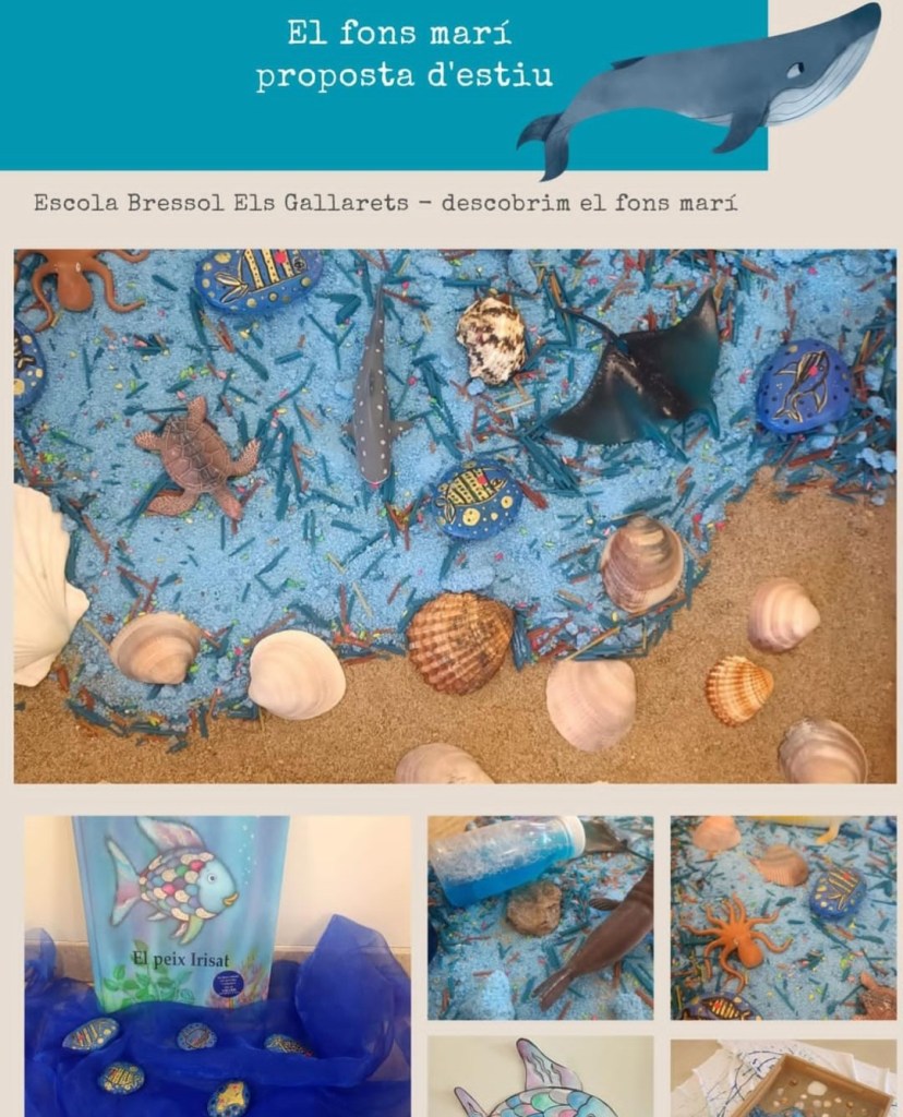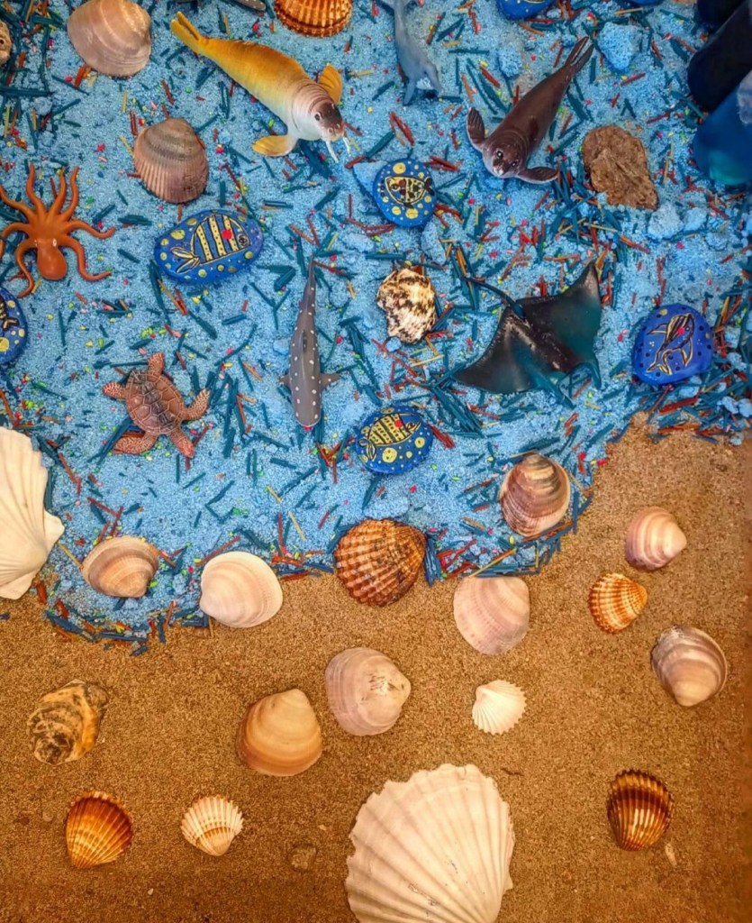Taula de manipulació amb animals marins, sorra de platja i sal tintada imitant el mar!!!