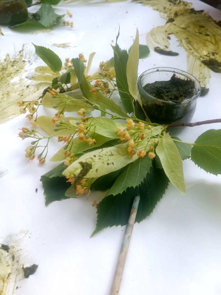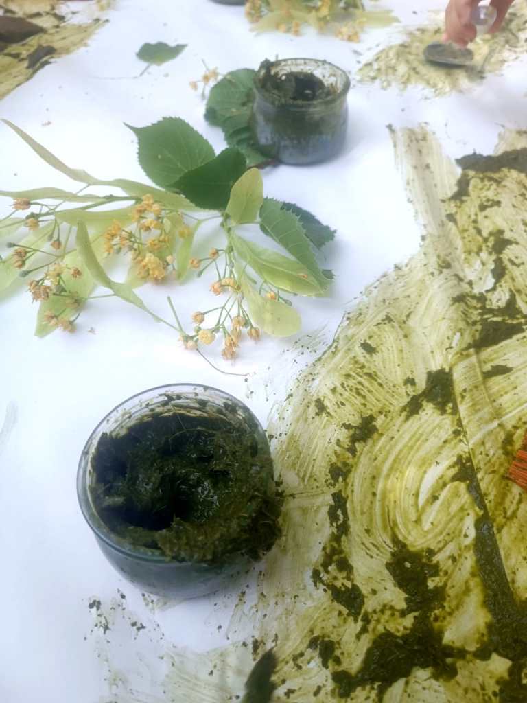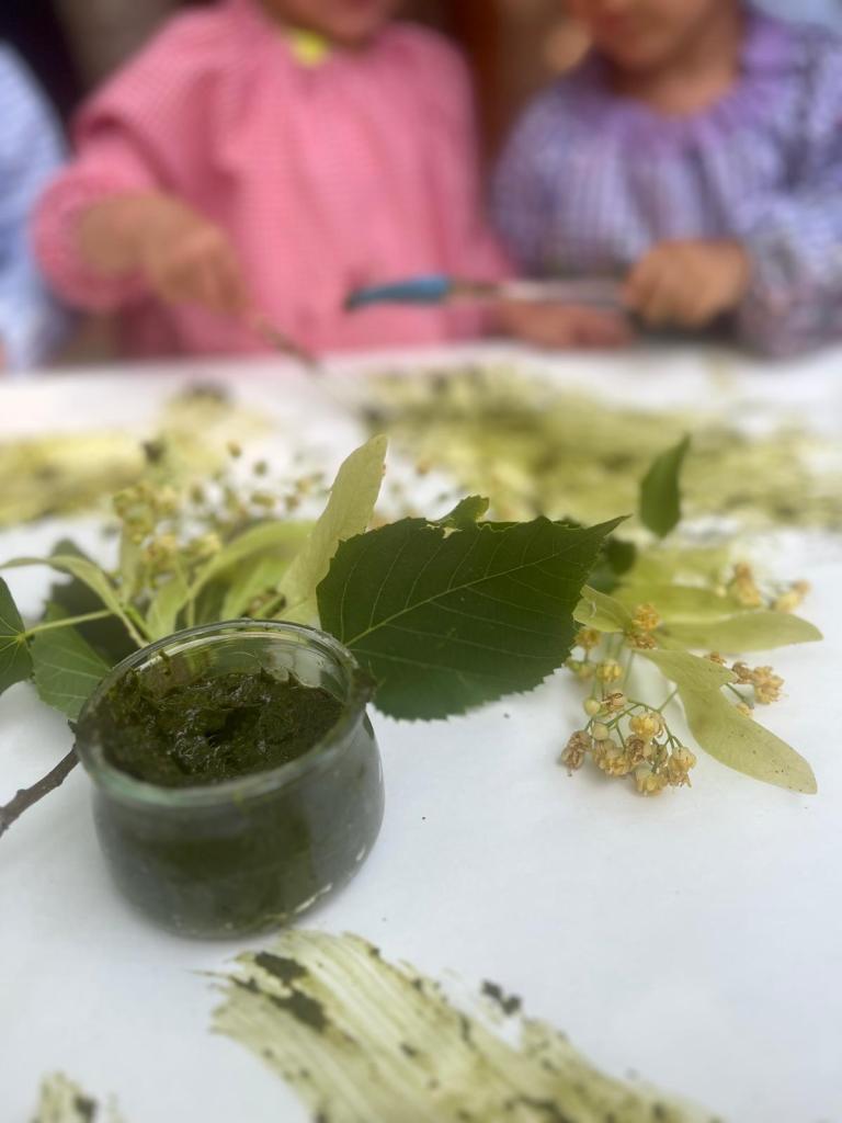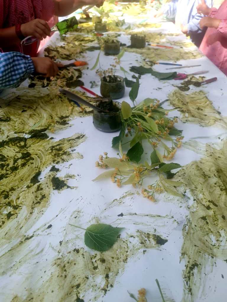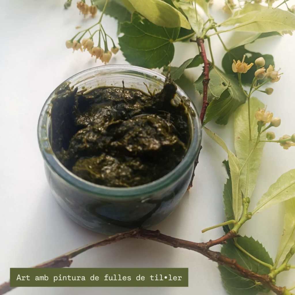 Creem pigment natural amb fulles dels ti•lers del jardí de la nostra escola.