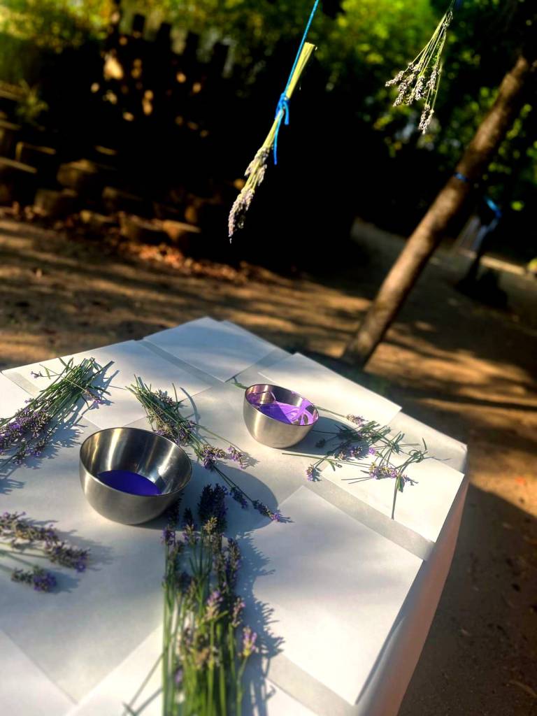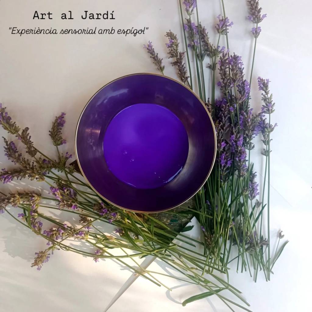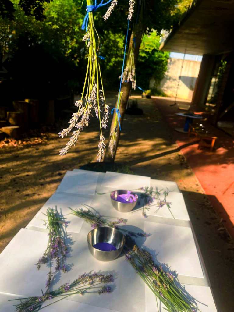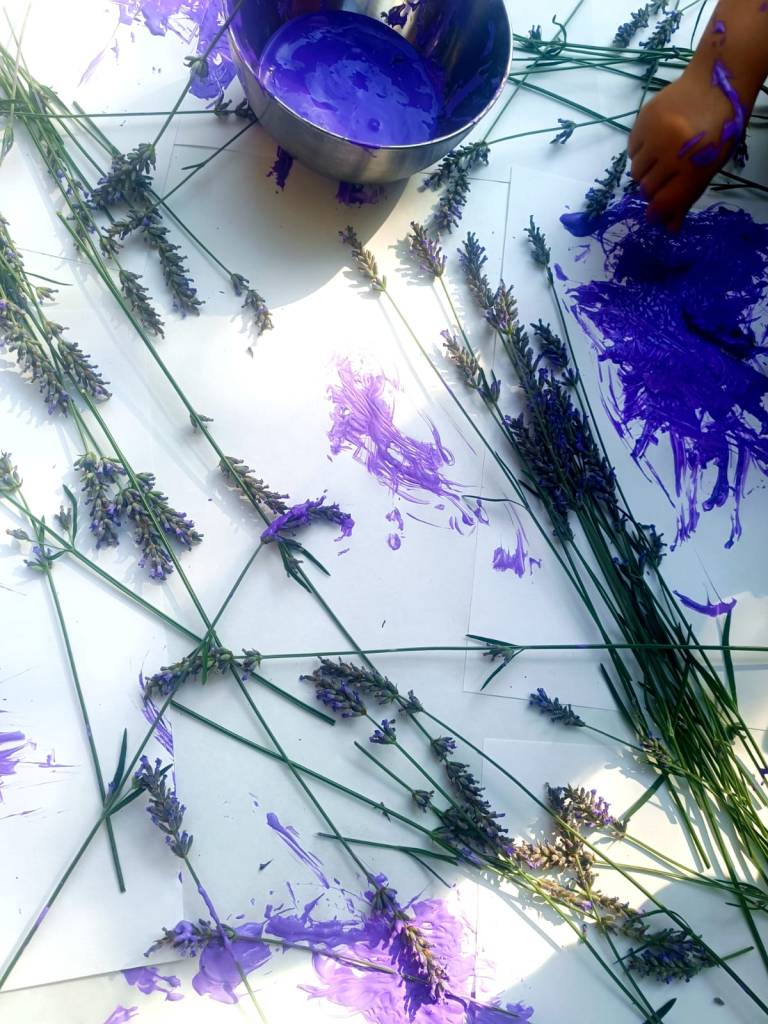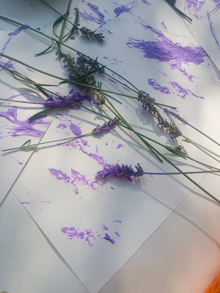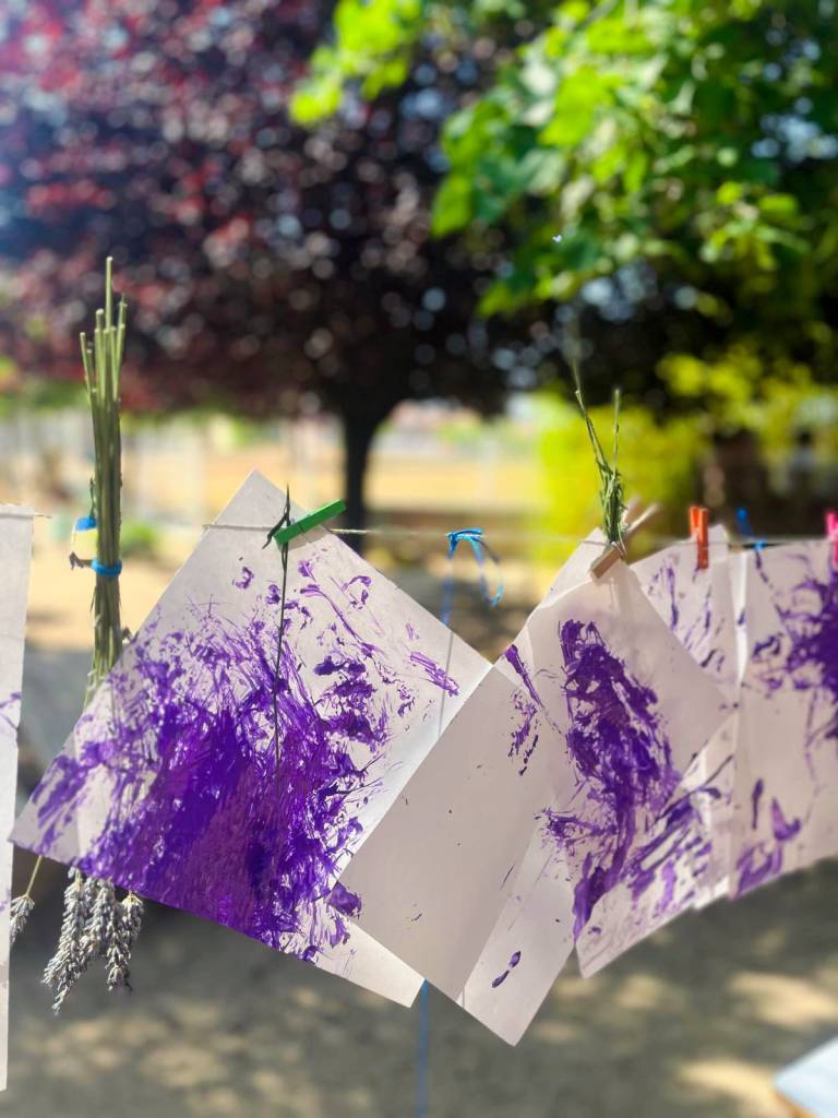 Proposta d’art al jardí amb espígol i pintura amb tonalitats liles 💜. Treballem el traç tant en vertical com en horitzontal fent ús de l’espígol com a eina de pintura.