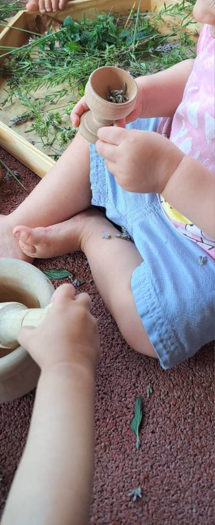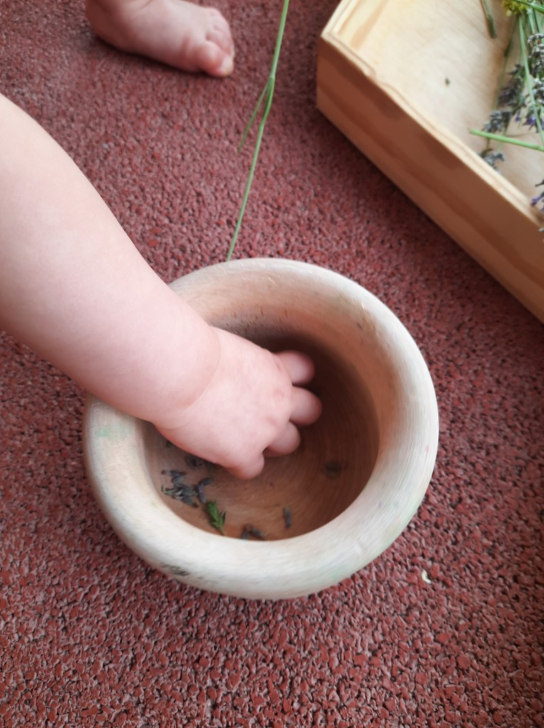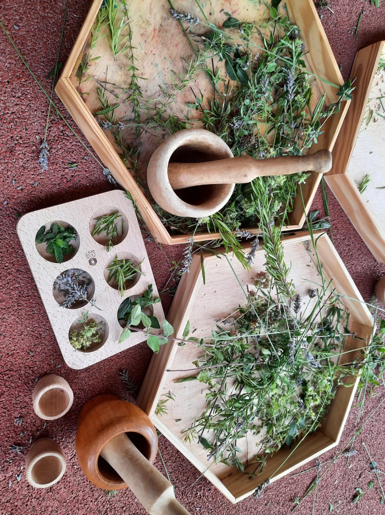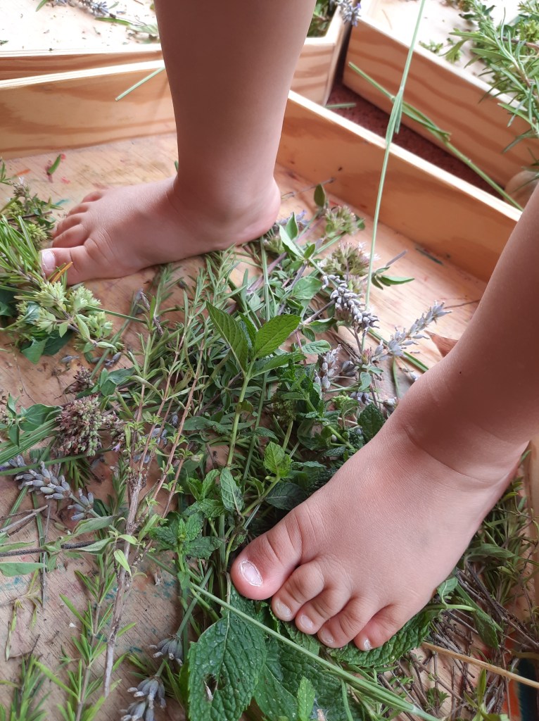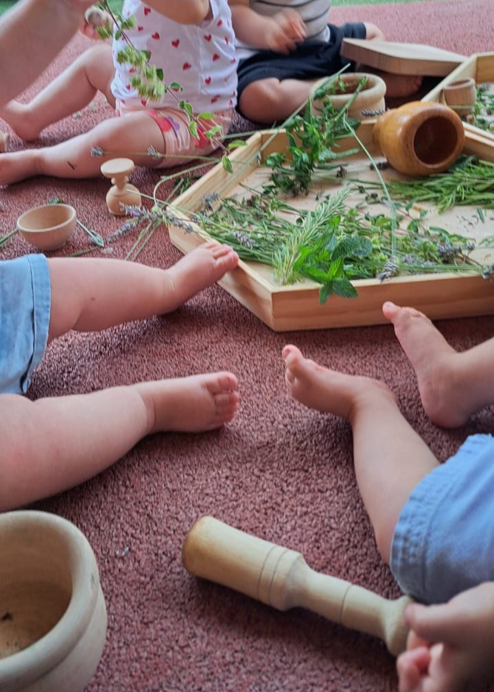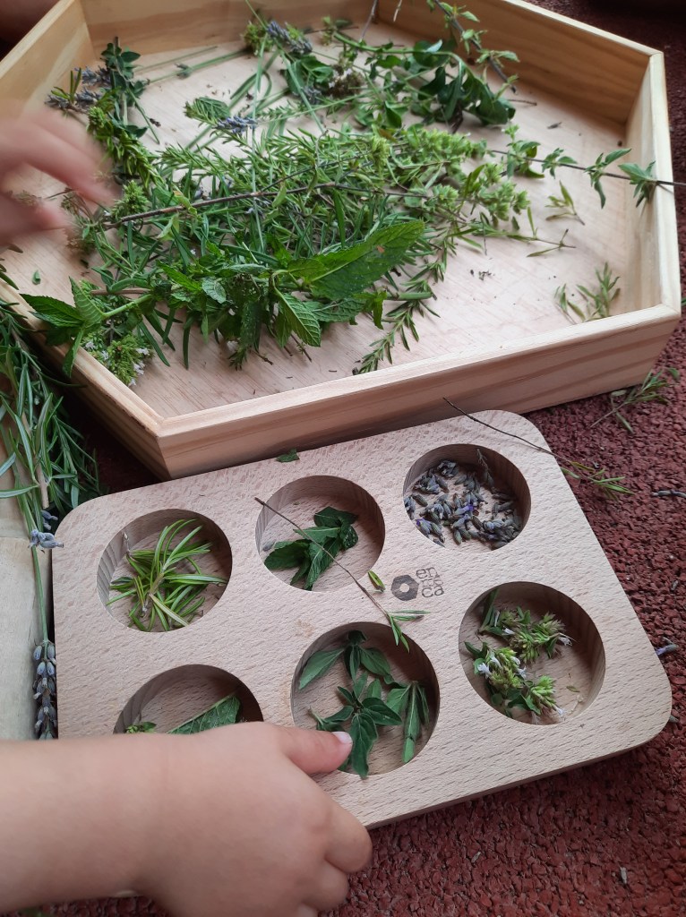 Avui a nadons hem manipulat a la fresca del jardí herbes aromàtiques del camí de les olors de la nostra escola. Treballem així, els sentits.